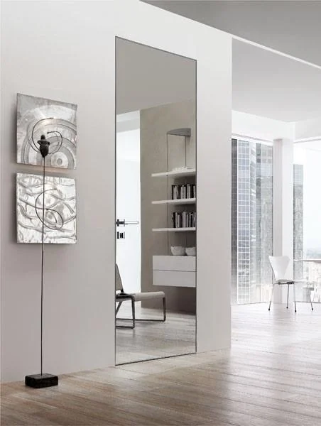 4. **Güzgülər:** Güzgü ilə örtülmüş qapılar ətrafdakı görmə qabiliyyətini qorumaq və otaqları böyütmək üçün istifadə edilən digər seçimdir. Güzgü ətrafdakıları əks etdirdiyi üçün qapı daha az nəzərə çarpır.